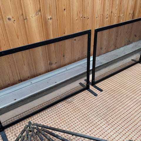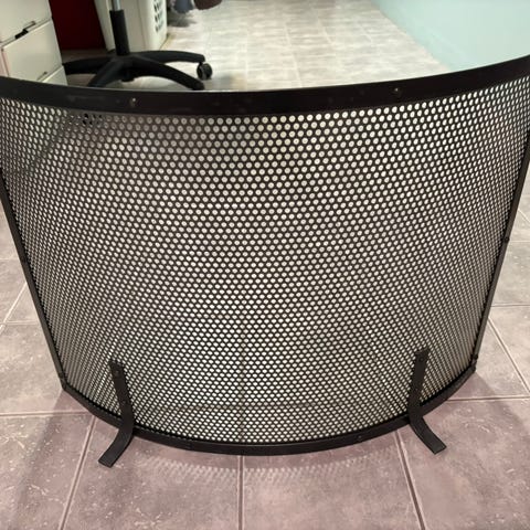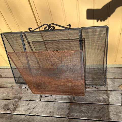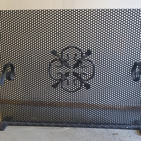 Eldskärm i svart smidesjärn med dekorativa svängda detaljer.