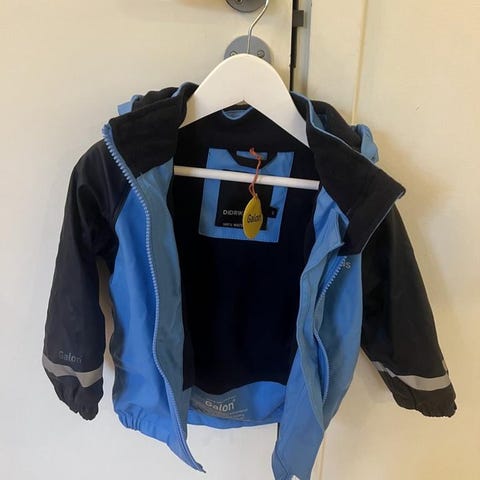 Fordrat regnställ från Didriksons i storlek 90. Jackan är i fint skick, byxorna har hål i grenen som säkert han lagas av den händige och som inte påverkar funktionen (se sista bilden).