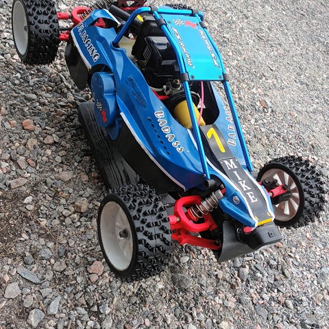 Kyosho radiostyrd bil av buggy-typ i vit och blå färg med avtagbar kaross. Bilen har grovmönstrade däck anpassade för körning på olika underlag och bakvinge för bättre stabilitet. I setet ingår en förvaringslåda med extra hjul, bränsleflaska och verktyg. Lämplig för hobbybruk och körning utomhus på exempelvis grus eller asfalt.