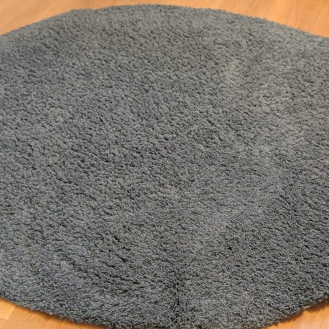 Rund, grön matta av hög kvalitet, måttbeställd på en inredningsbutik.