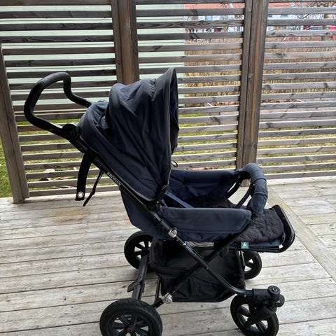 Emmaljunga sittvagn i grått utförande. Vagnen har vadderad sittdel med fempunktssele, justerbart ryggstöd och fotstöd samt båge framtill. Chassi med fyra hjul och handtag baktill. Till vagnen hör en lös åkpåse i blå färg från Emmaljunga, anpassad för att ge extra värme i sittdelen. Medföljer också ett myggnät och regnskydd