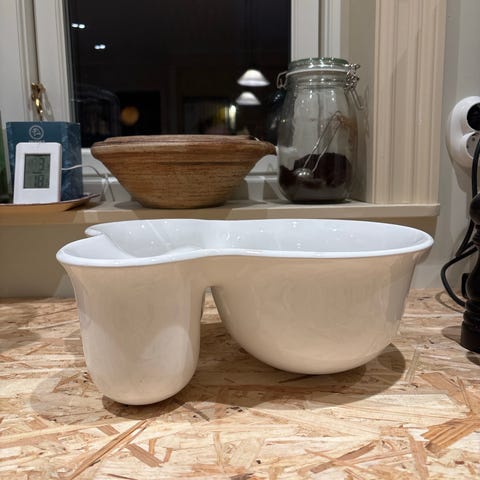 Nätt vit skål / serveringsskål i tålig melamin. Ovanlig design med diagonal form vid överkanten ger ett intressant uttryck. Fint skick.