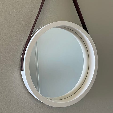 Hay Strap Mirror spegel med rund form och diameter på 50 cm. Spegeln har en mörkbrun ram och upphängningsrem i samma färg. Passar för väggmontering i exempelvis hall, sovrum eller vardagsrum. Designen ger en tydlig spegelbild och fungerar som ett praktiskt inslag i inredningen.