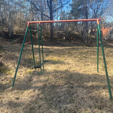 Gungställning med en dubbelgunga bortskänkes, isärskruvad, går att ta på takräcke.