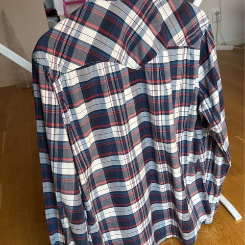 Modellen har lång ärm, krage och knäppning framtill med tryckknappar. Två bröstfickor med lock och knapp på framsidan. Passar som vardagsskjorta eller som ett extra lager över t-shirt eller tröja.