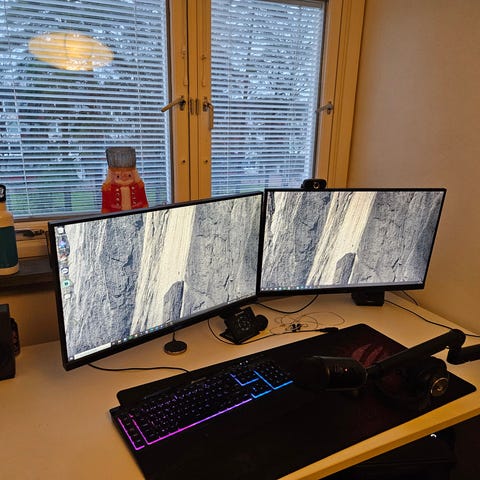 Säljer nu min gaming setup , det som ingår är skärmarna, skärmarmarna ,datorn , Gaming keyboard, gaming mus , musmatta och gaming hörlurar . Vänstra skärmen är 1080p 165 hz 27 tum och den andra är 1440p 180 Hz 27 tum .