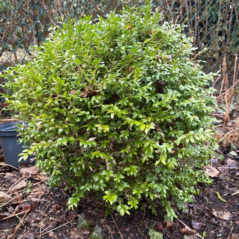 Väletablerad buxbom. Passar som prydnadsväxt i trädgård eller rabatt. Planterad direkt i marken och kan användas som låg häck eller solitärbuske beroende på placering och beskärning.