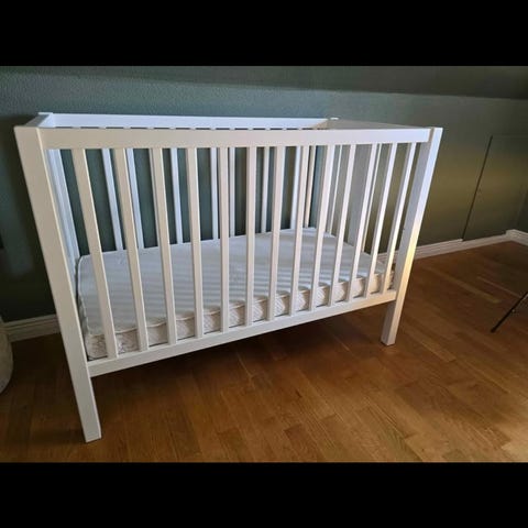 BabyDan spjälsäng i vit färg. Klassisk spjälsäng med rundade kortsidor och ribbor runtom. Passar som sovplats för spädbarn och småbarn. Sängen är avsedd för användning inomhus i barnrum eller sovrum tillsammans med madrass och sängkläder i standardmått för spjälsäng (madrass och textilier enligt säljarens uppgift). Använd sparsamt till på besök.