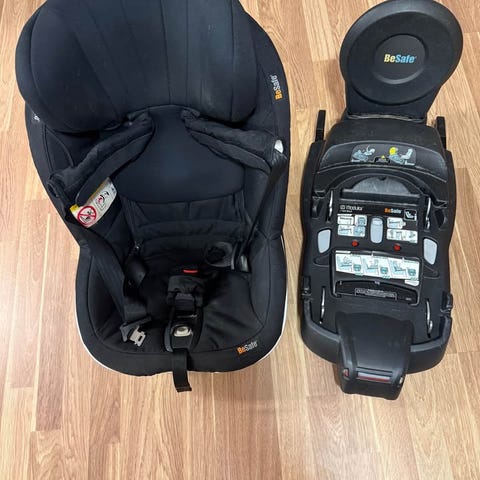 BeSafe iZi Plus bilbarnstol i storlek 25. Bakåtvänd stol som monteras med bilens trepunktsbälte och stödben. Stolen är svart och har justerbart huvudstöd och internbälte. Passar barn inom storleksintervall 25 enligt BeSafes rekommendationer. Klädseln är avtagbar och kan normalt tvättas enligt skötselråd. Levereras med bruksanvisning som visar montering, inställningar och användning i olika bilar.