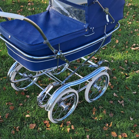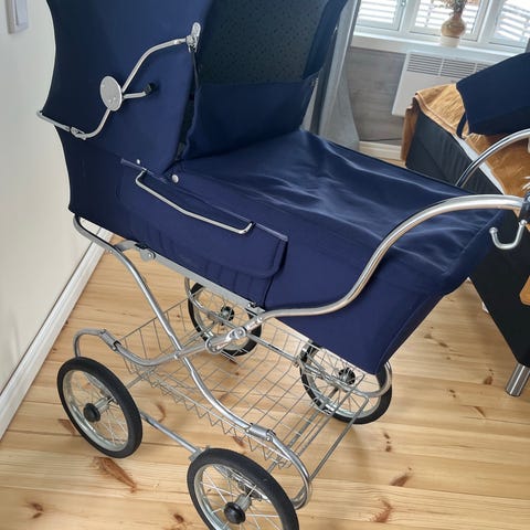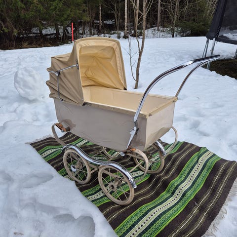 Emmaljunga retro sulky/sittvagn i beige tyg med bruna ränder. Vagnen har lätt metallchassi, fyra hjul och enkel sittdel. Ryggstödet går att luta till viloläge. Ytrost finns på chassit. Klädsel och däck i fint skick.