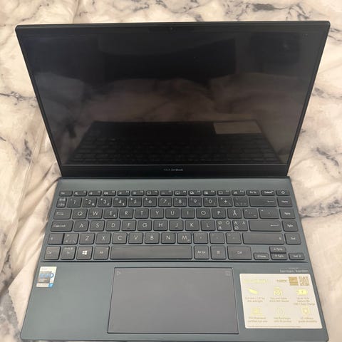 AI beskrivning: Asus Zenbook laptop med OLED-skärm. Bärbar dator med tunn design och fullstort tangentbord. Skärmen är en OLED-panel som ger hög kontrast och tydliga färger. Lämplig för vardagsbruk, kontorsarbete och medieanvändning.