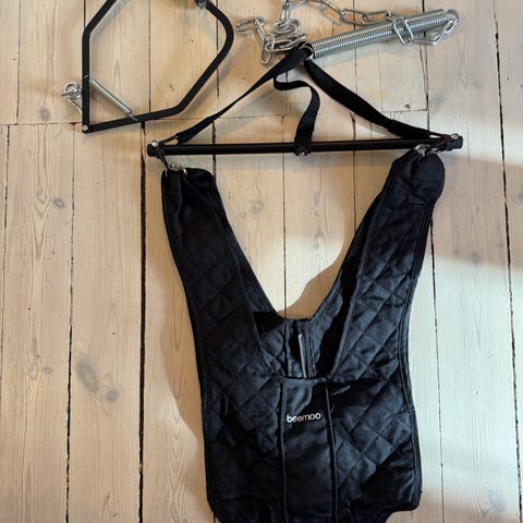 En Hoppgunga som fästes genom att klämmas fast utanför dörrkarm. Använd endast en gång då vårt barn inte gillade hoppgungan, därav i mycket gott skick. Mörkgrå i färgen. Maxvikt 12 kg.