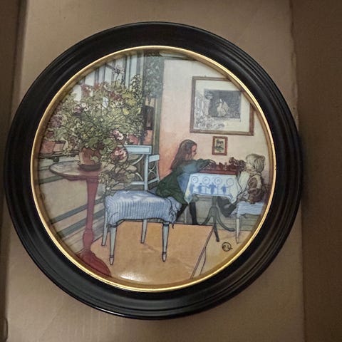 Rund bricka i plåt med motiv av häst och vagn i lantlig miljö. Flerfärgat tryck med grön kant. Brickan är baserad på original av Erik Forsman, enligt märkning på baksidan. Passar som serveringsbricka eller som dekorativ inredningsdetalj.
