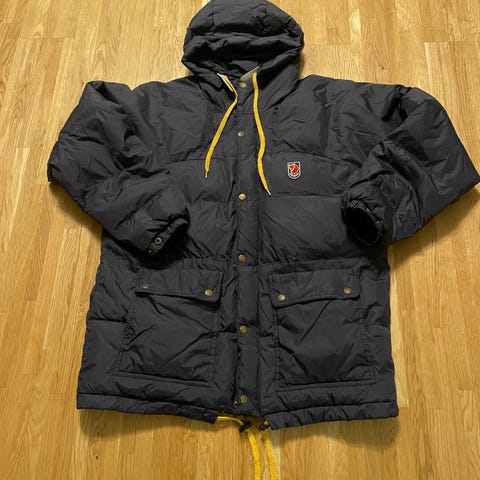 Fjällräven vinterjacka för herr i storlek 52-54. Jackan är blå och fodrad med dun. Modellen har huva, hel dragkedja med knappslå samt flera ytterfickor framtill. Avsedd som varm vinterjacka för utomhusbruk.