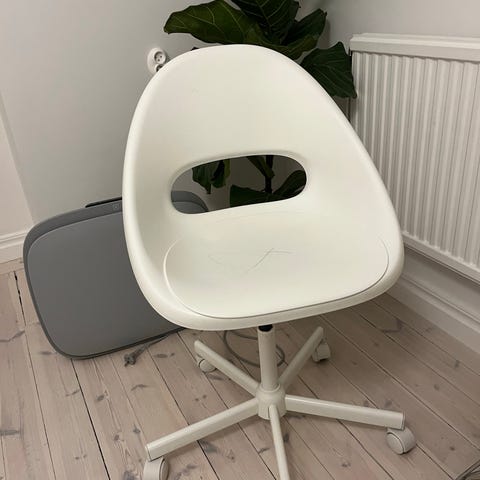 Ikea kontorsstol i vit plast med sits och rygg i ett stycke och öppning i ryggen. Stolen har vit snurrfot med hjul och är avsedd för inomhusbruk, exempelvis vid skrivbord eller arbetsplats. Hjulen är sega men fungerar :)