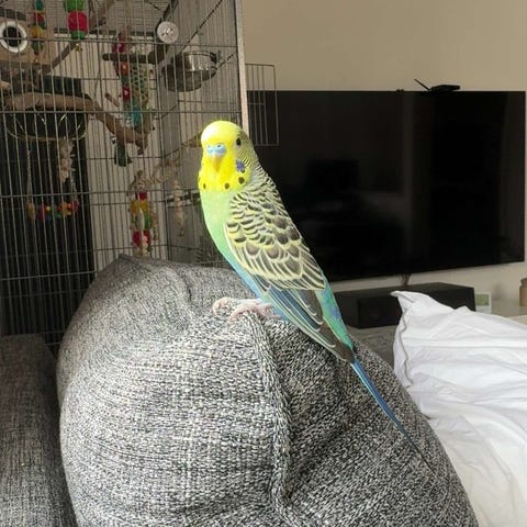 Hon är van vid att alltid ha buren öppen, men hon lämnar sällan sin gren nuförtiden.