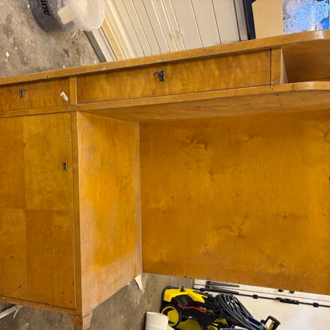 Säljer ett stabilt, äldre skrivbord i ek. Fyra lådor, varav de tre till höger ”låses” när lådan till vänster stängs helt, nyckel till låset saknas dock. En utdragbar skiva sitter över lådorna (skärbräda/arbetsyta). Skicket är ”slitet”, men allt sitter stabilt och bra, lådorna glider oxå bra.
