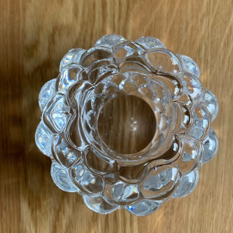 Marimekko glasvas i klar glas. Vasen har en rundad form med bredare nederdel och smalare, klotformad överdel. Passar för mindre blombuketter eller som dekorativ inredningsdetalj. Märkt Marimekko i botten.