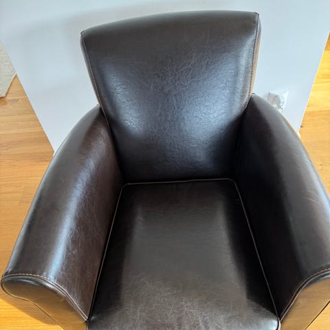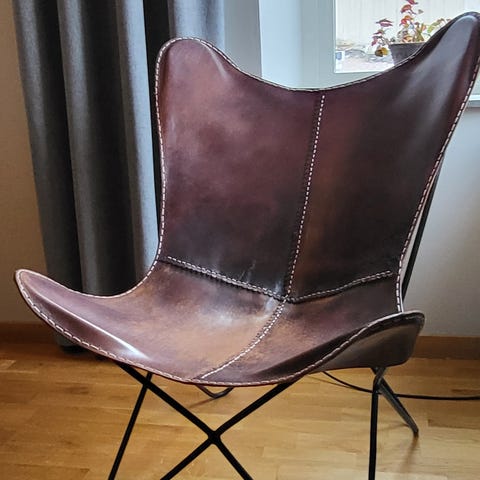 Fåtölj i så kallad butterfly‑modell med sits och rygg i brunt läder. Stolen har synliga sömmar och kantdetaljer runt hela sitsen. Underredet är i metall med korslagda ben som ger en lätt och luftig konstruktion. Passar som extra sittplats i vardagsrum, sovrum eller läshörna.