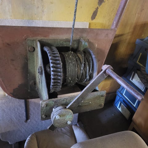 En vinsch med band inköpt på Biltema för 10 år sedan och använd en gång för att lyfta ur motorn i en epatraktor och har legat i förrådet sedan dess. Klarar 1150 kg.
