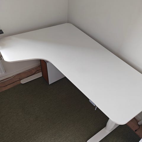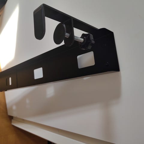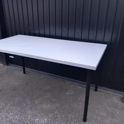 Specialbeställd skrivborsskiva från Ikea. 360 x 80 cm, svartmelerad, aluminiumförstärkt ram, 2 förborrade hål för kablar på vardera arbetsplats. Kan med fördel även användas som arbetsbänk i t.ex verkstad. Nypris cirka 6 600 kr. Finns även två höj- & sänkbara underreden att köpa till.