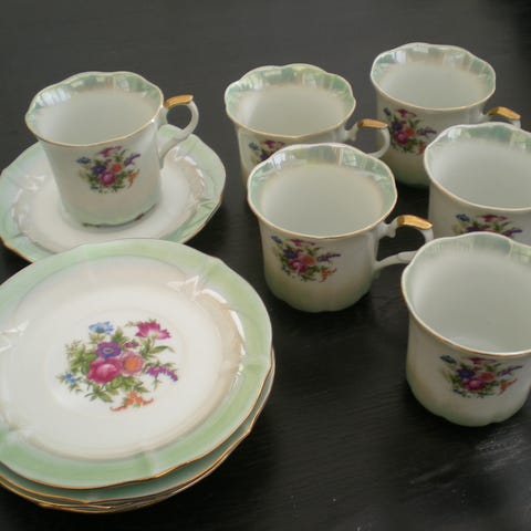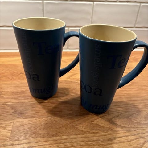 Set med 7 vita muggar i porslin. Muggarna har enkel dekor med räfflade linjer upptill och klassiskt handtag. Passar för servering av kaffe, te eller andra varma drycker i hemmet eller på kontoret. Rymmer 5 dl.