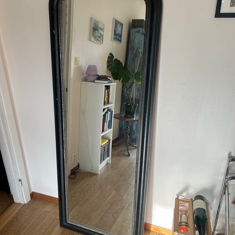 Säljer en sick-sack-formad spegel i fint skick. Fästen för att hänga upp den på väggen ingår.