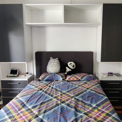 Får plats med 180cm bred säng. Tillkommer ett till skåp man kan montera till som inte är med på bilden. Har med hjälp av AI roterat bilden så man får en bild rakt framifrån(bild 1 & 3)