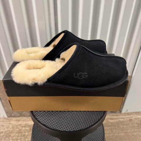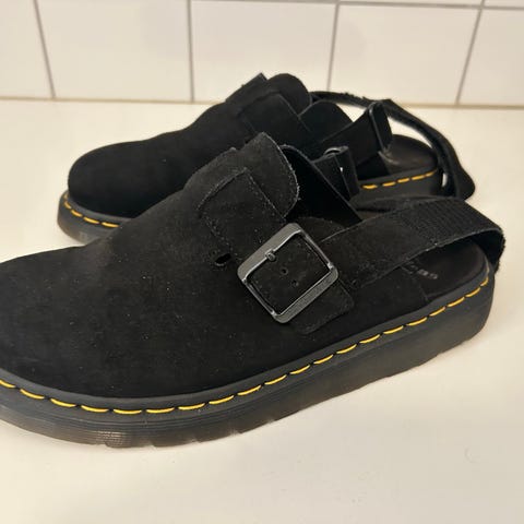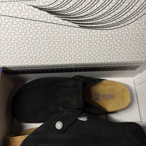 Birkenstock tofflor i storlek 45. Modellen har sluten tå och öppen häl med justerbar rem över foten. Ovandelen är i svart läder och innersulan är formad för att ge stöd åt foten. Yttersulan är slitstark och lämpar sig för inomhusbruk och lättare utomhusbruk. Passar som bekväma tofflor i hemmet eller på arbetet.