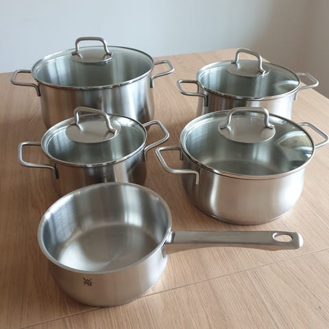 Setet innehåller kastruller och stekpanna med glaslock och handtag. Kokkärlen är anpassade för vardaglig matlagning och passar för olika typer av rätter som såser, grytor och stekning.