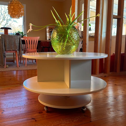 Bordet går att fälla ihop och blir då väldigt smalt. Bordet är gjord av hård plast. Bordet väger inte så mycket.