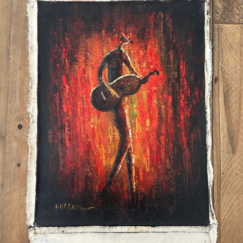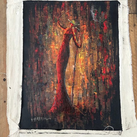 Tavla med motiv av en kvinna med paraply vid vatten. Konstverket visar en siluett i röd klänning mot en bakgrund i varma och kalla toner.