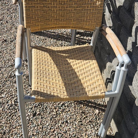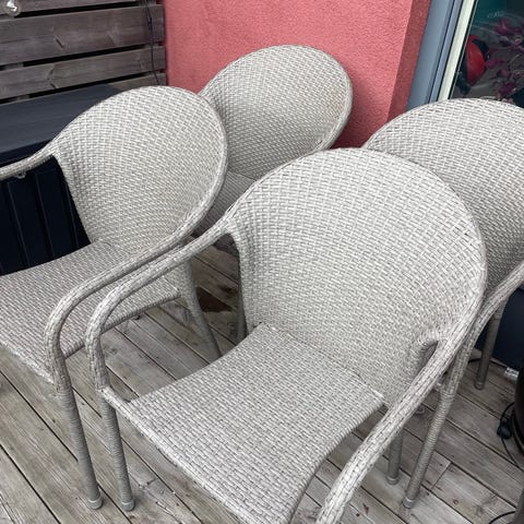 Trädgårdsstolar i kombination av metall och trä. Bra skick över lag, men på en av stolarna har den vävda sitsen lossnat lite.