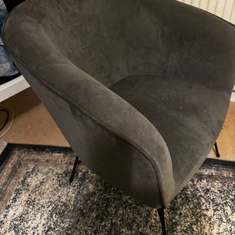 Ett skönt tyg, ej sammet. Den är knappt använd, har stått i hörnet av vårt sovrum och mest haft kläder på sig.