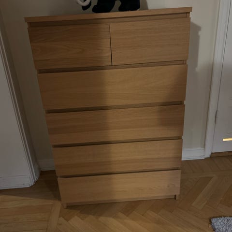 Säljer en fin byrå i trä med totalt fyra lådor. De två nedersta är egentligen en stor, extra djup låda (lika stor som två vanliga tillsammans).