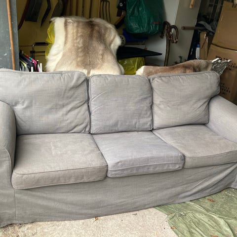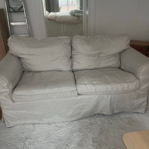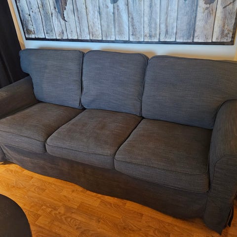 Klassisk Ektorp 3-sits soffa säljes pga platsbrist. Den är skön att sitta i men det fungerar också bra att ta bort ryggstödsdynorna och ha som en extra sovplats. Katter finns i hemmet. Klädseln är lätt att ta av och tvätta. Måtten finns på en av bilderna.