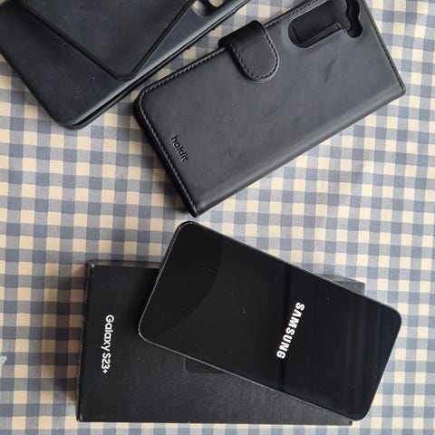 Samsung Galaxy S23 Ultra smartphone med 256 GB intern lagring. Enheten har stor pekskärm, flera bakre kameror och frontkamera i skärmens överkant. Färg: svart. Lämplig för appar, surf, foto och video samt lagring av filer, bilder och media.