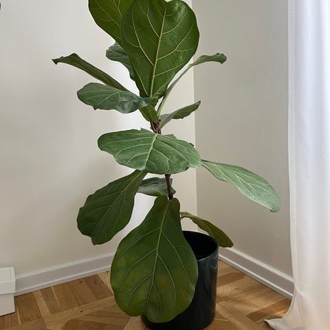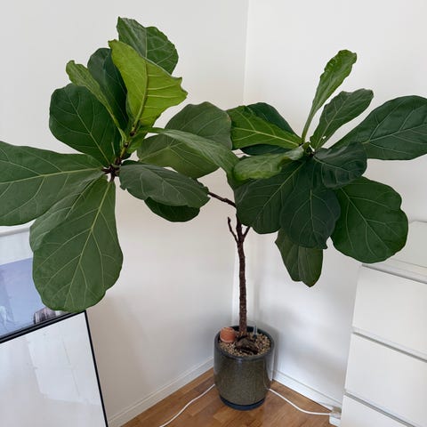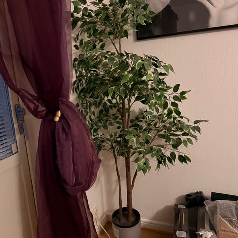Fiolfikus träd 150 cm höjd med breda, gröna blad. Växten står planterad i en rund, vit Lechuza kruka som har inbyggda hjul som är lätt att flytta samt självbevattningssystem. Placeras med fördel ljust inomhus, men inte i direkt stark sol. Kräver regelbunden vattning och trivs i normal rumstemperatur. Trädet är inköpt på Vellinge blomman nypris 4000,- samt kruka 1700,-