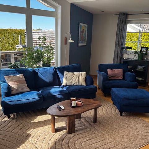 Två stycken fåtöljer, ”bäddsoffa” från IKEA, som man kan bädda ner till en extrasäng.