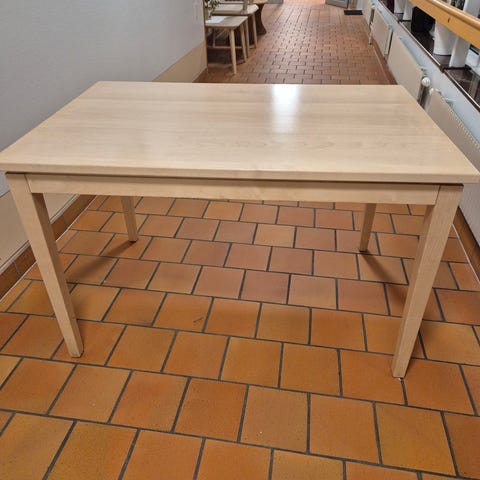 Rektangulärt matbord i ljusbrunt trä. Bordet har rak, enkel design med fyra ben och slät bordsskiva. Passar som matbord eller arbetsbord i kök, vardagsrum eller mindre utrymmen. Storleken är anpassad för ett mindre sällskap och bordet står på trägolv i bilderna, vilket ger en uppfattning om proportionerna.