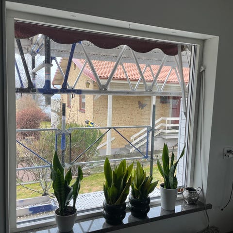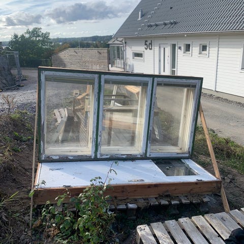 Fönster med vit karm, några med 3 glas, några med 2 glas några med 1 glas.