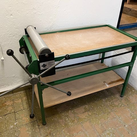 Ystads Gjuteri & Mek Verkstad manuell mangel med stort träbord och handvev. Maskinen har en massiv mangelkavel och ett stabilt underrede i metall med kugghjul och justerskruv för tryckinställning. Träbordet ger en plan yta för mangling av textilier. Lämplig för mangling av lakan, dukar och andra större textilier.