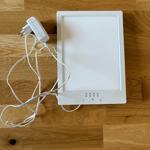 Ljus/Solterapilampa av märket Vägg-Solstråle/Seinä-Päivänsäde avsedd för 230 V, 50 Hz med max 36 W ljuskälla. Utrustad med vit sladd och strömbrytare på sladden. Denna lampa har räddat min hälsa under flera vintrar, men nu flyttar jag till ekvatorn så jag får naturligt ljus istället!