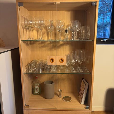 Ett fint bar vitrinskåp. Plats för hängande glas som är upplysta av ljuslist i alla plan. Det finns en dragkedja för förvaring. Glasdörrarna har nyans av brunt för att matcha skåpets vackra lyster.