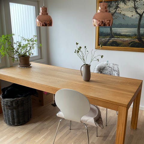 Fint bord i massiv ek. Bordet har inbyggd butterfly-skiva och är i fint skick utan skador eller märken.