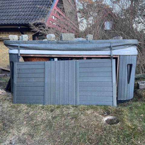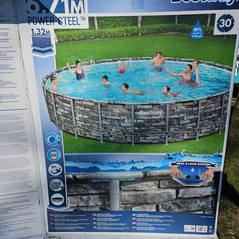 Poolen är inköpt mars 2026 som vattenreservoar vid taktvätt. Hoppas hitta nytt hem till den även om den behöver rengöras. Alla tillbehör på kartongen finns. Inga skador eller revor på duken.