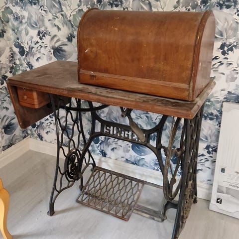 Singer symaskin med dekorativ svart metallkropp och färgrika ornament. Maskinen är monterad på ett infällt träbord/underrede och drivs med elektrisk fotpedal. På bilderna syns även en hård väska för förvaring och transport samt en originalförpackning från Singer med tillbehör. Lämplig för olika typer av sömnadsarbeten i hemmet, exempelvis lagning och enklare sömnadsprojekt.