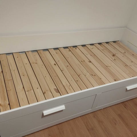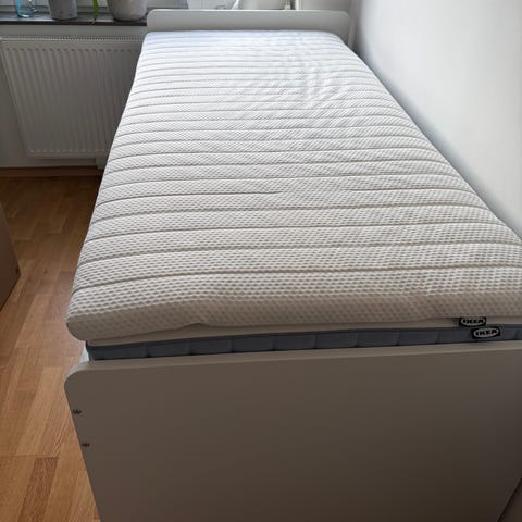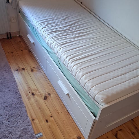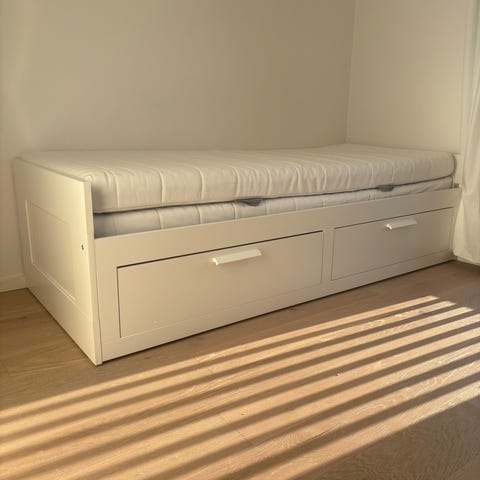 Finns lite slitage på utsidan av vänster sänggavel samt längs framsidan. Madrasserna medföljer om ni vill ha dem, bara den ena som är använd.