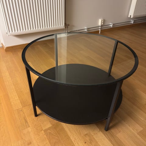 Svart runt soffbord med en glasskiva upptill och en svart hylla undertill. Bordet har en modern design och passar bra i vardagsrummet.