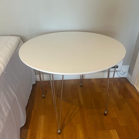 Bordet är stabilt och i gott bruksskick. Märken i bordsskivan och märken från kaffekoppar(se bilder) finns i ytan, men dessa har inte påverkat användningen då bordet med fördel används med duk – vilket också ger en mer ombonad känsla.